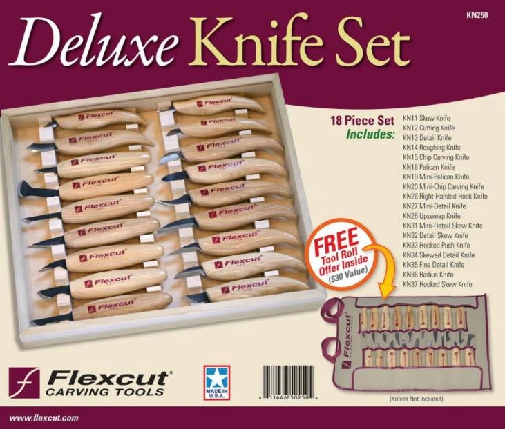 Our Deluxe Knife Set features the most extensive collection of fixed blade carving knives in the industry to give carvers a wide range of capabilities in one economical package. This set includes 18 razor-sharp carving knives designed for roughing to very detailed carving projects. Knives included: KN11 Skew Knife, KN12 Cutting Knife, KN13 Detail Knife, KN14 Roughing Knife, KN15 Chip Carving Knife, KN18 Pelican Knife, KN19 Mini-Pelican Knife, KN20 Mini-Chip Knife, KN26 Right-Handed Hook Knife, KN27 Mini-Detail Knife, KN28 Upsweep Knife, KN31 Mini-Detail Skew Knife, KN32 Detail Skew Knife, KN33 Hooked Push Knife, KN34 Skewed Detail Knife, KN35 Fine Detail Knife, KN36 Radius Knife, KN37 Hooked Skew Knife. Dimensions Length: 1.75 inches Width: 13.90 inches Height: 12.00 inches Weight: 49.00 Pounds