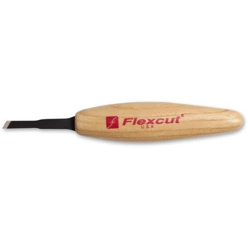 Individual miniature Flexcut skew chisel.The overall length including the carefully shaped handle is 140mm. Flexcut use superior steel with which to make their tools; it will take an edge and hold it better than many other carving tools. Use these carving tools for the finest detail work including cleaning up tight corners and ridges, carving fine details such as mouths and eyes, and adding texture like hair, fur and feathers. 3mm (1/8″) wide